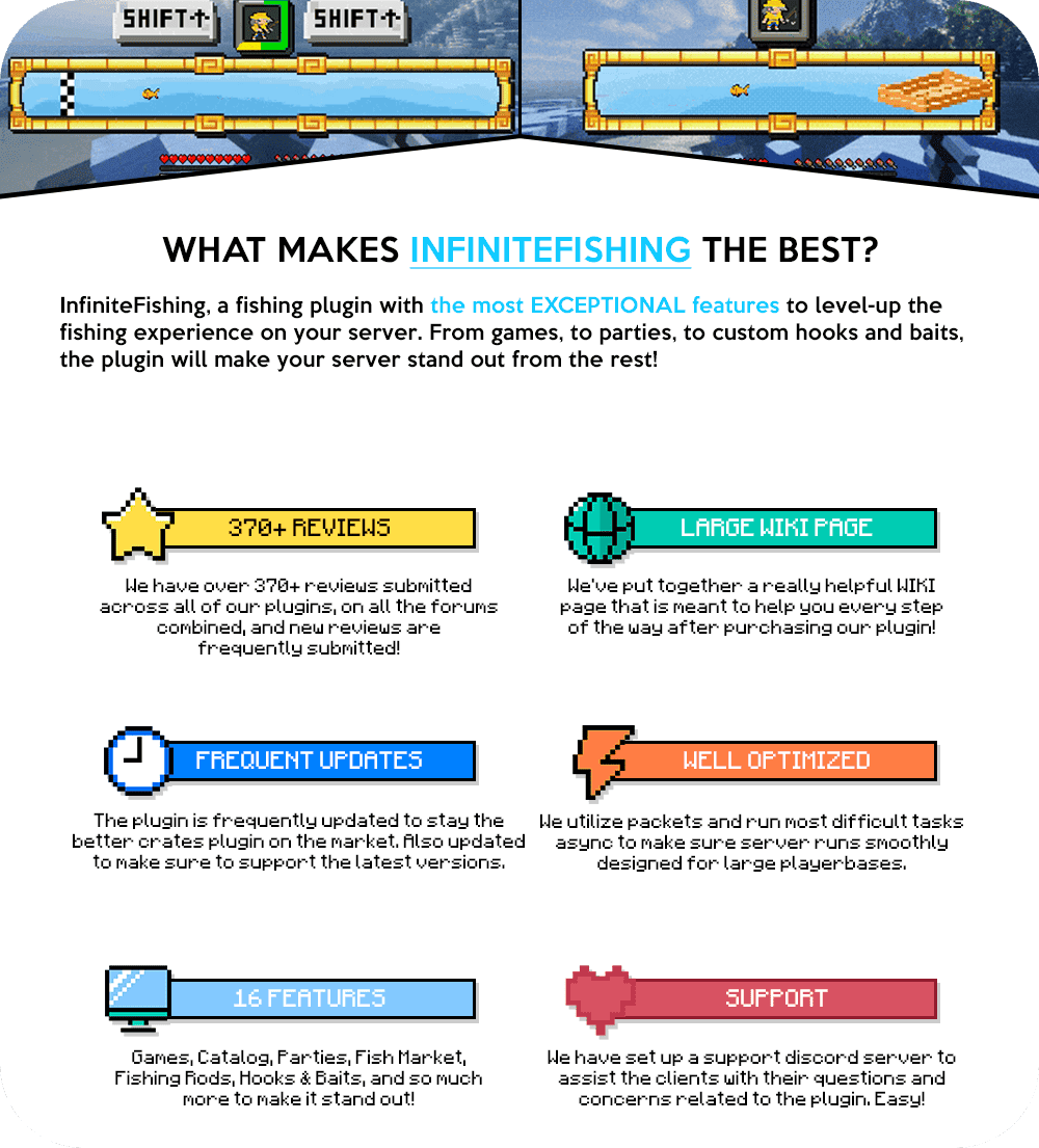 InfiniteFishing, a fishing plugin with the most Exceptional Features to level-up the fishing experience on your server. From games to parties to custom hooks and baits, the plugin will make your server stand out from the rest!