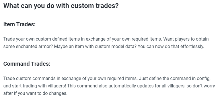 These trades will act like normal trades. Villagers will gain experience (customizable in config), you can assign unlimited commands and modify commands for these trades, even in pre-existing villagers, dynamically.